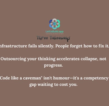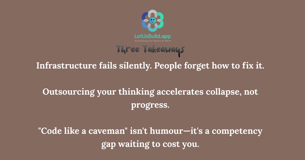 Organisations need to maintain—actively, deliberately—the ability to function without these tools. Not as a theoretical exercise, but as a core operational requirement. This means investing in junior developer training that doesn't rely on AI. It means building systems with resilience and redundancy. It means asking harder questions about what happens when infrastructure fails.
