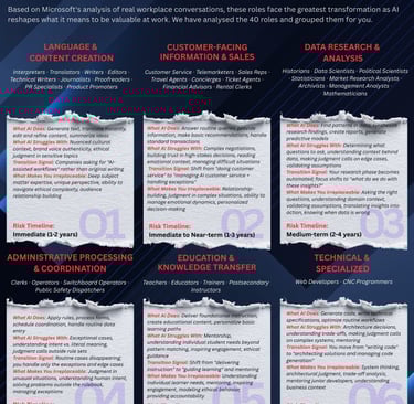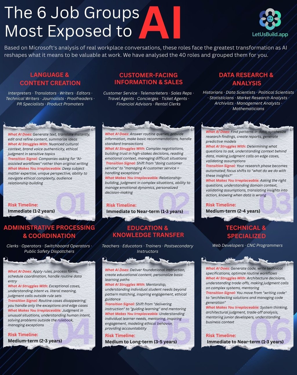 Based on Microsoft's analysis of 200,000 real workplace conversations, these 40 jobs fall into 6 groups. Each faces different timelines and pressures. Find your role and assess what makes you irreplaceable beyond the routine work AI can handle.
